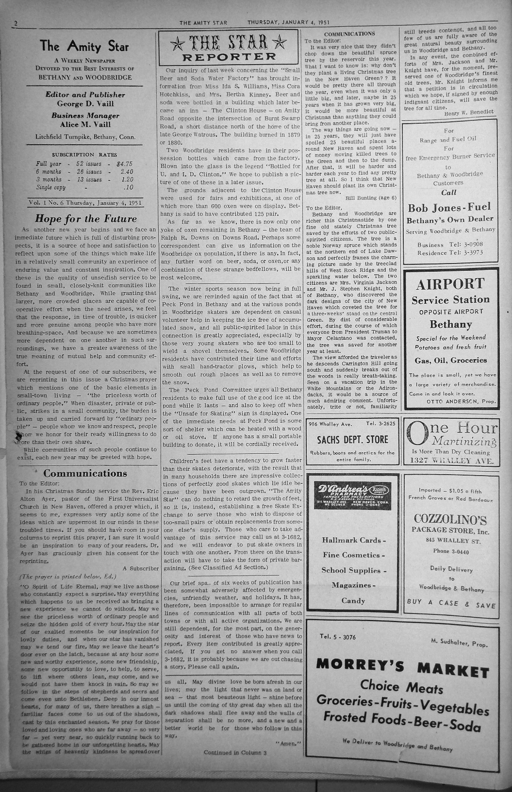 As another new year begins and we face an immediate future which is full of disturbing prospects, it is a source of hope and satisfaction to reflect upon some of the things which make life in a relatively small community an experience of enduring value and constant inspiration. One of these is the quality of unselfish service to be found in small, closely-kknot communities like Bethany and Woodbridge. While grantingi that larger, more crowded places are capable of cooperative effort when the need arises, we feel that the response, in time of trouble, is quicker and more genuine among people who have more breathing-space. And because we are sometimes more dependent on one another in such surroundings, we have a greater awareness of the true meaning of mutual help and community effort.