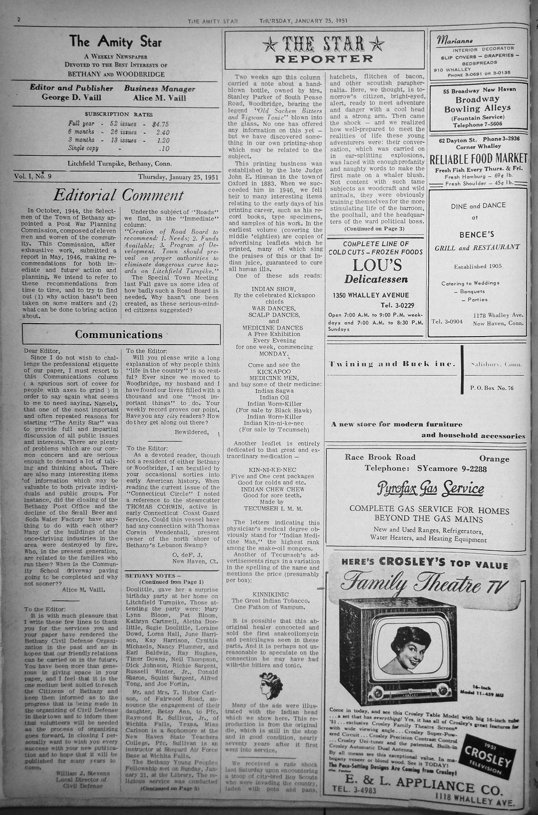Since I do not wish to challenge the professional etiquette of our paper, I must resort to this Communications column (a spurious sort of cover for people with axes to grind) in order to say again what seems to me to need saying. Namely, that one of the most important and often repeated reasons for starting "The Amity Star" was to provide full and impartial discussion of all public issues and interests. There are plenty of problems which are our common concern and are serious enough to demand a lot of talking and thinking about. There are also many interesting items of information which may be valuable to both private individuals and public groups. For instance, did the closing of the Bethany Post Office and the decline of the Small Beer and Soda Water Factory have anything to do with each other? Many of the buildings of the once-thriving industries in the area were destroyed by fire. Who, in the present generation, are related to the families who run them? When is the Community School driveway paving going to be completed and why not sooner??