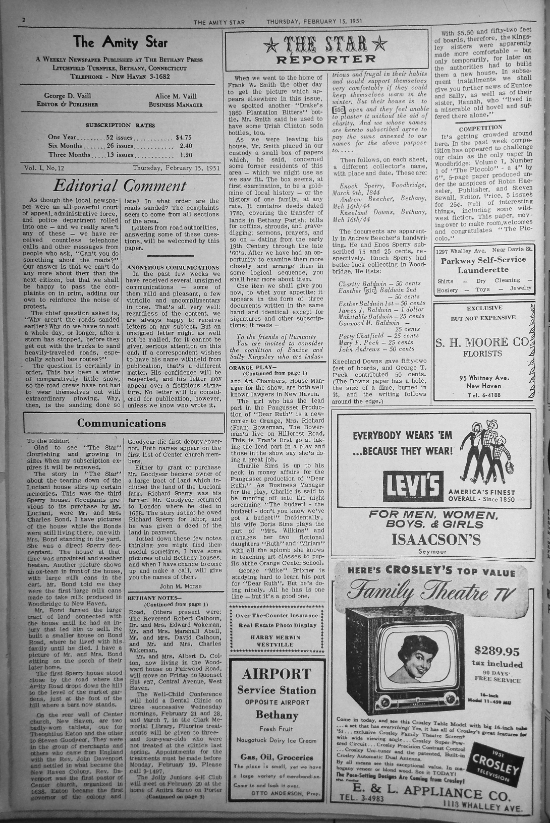 It's getting crowded around here. In the past week competition has appeared to challenge our claim as the only paper in Woodbridge: Volume I, Number 1 of "The Piccolo" -- a 4" by 6", 5-page paper produced under the auspices of Robin Haeseler, Publisher, and Steven Sewall, Editor. Price, 5 issues for 25¢. Full of interesting things, including some wild-west fiction. This paper, moving over to make room, welcomes and congratulates "The Piccolo."