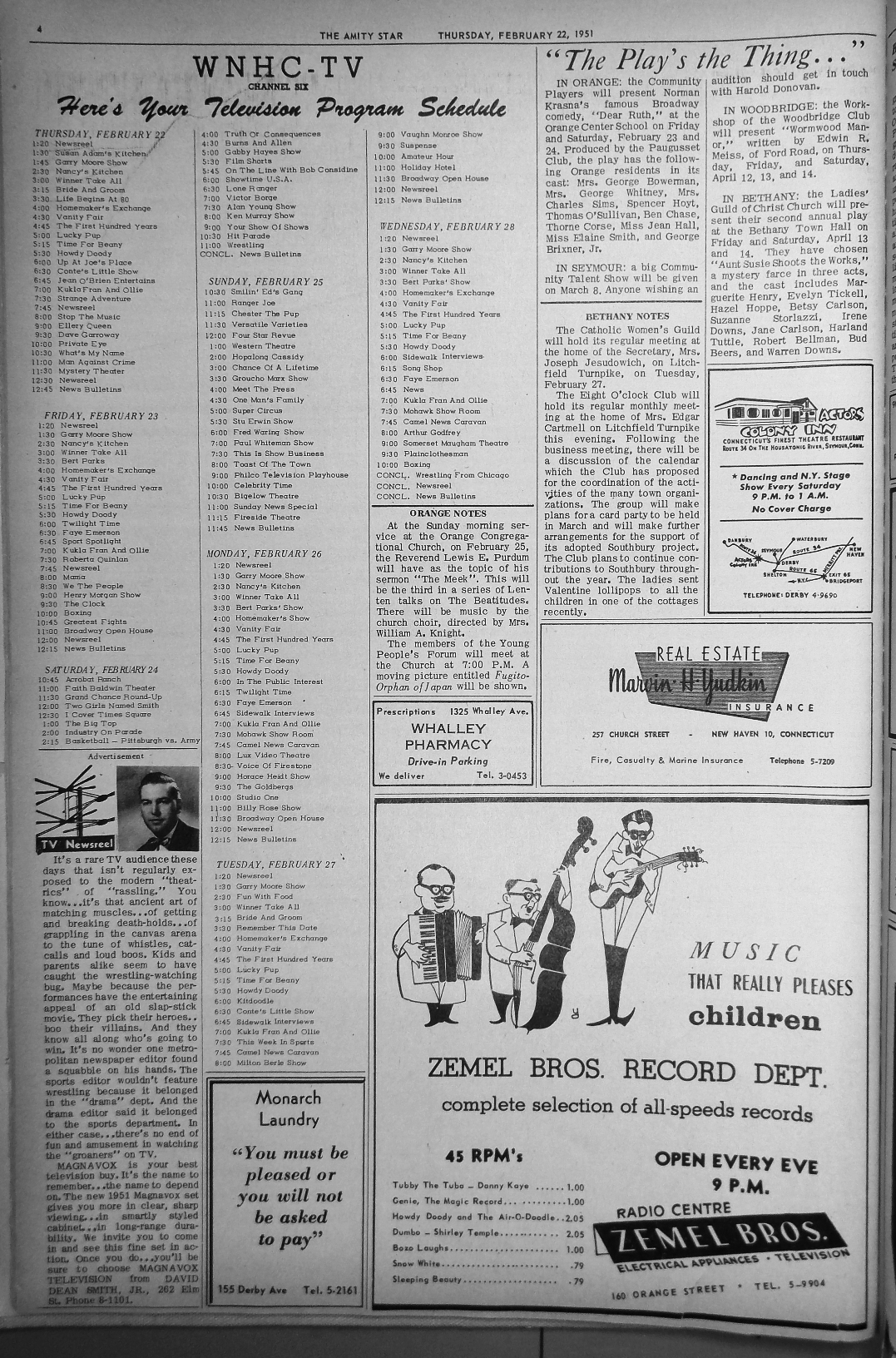 In Orange: the Community Players will present Norman Krasna's famous Broadway comedy, "Dear Ruth," at the Orange Center Schoool on Friday and Saturday, February 23 and 24. Produced by the Paugusset Club, the play has the following Orange residents in its cast: Mrs. George Bowerman, Mrs. George Whitney, Mrs. Charles Sims, Spencer Hoyt, Thomas O'Sullivan, Ben Chase, Thorne Corse, Miss Jean Hall, Miss Elaine Smith, and George Brixner, Jr.
