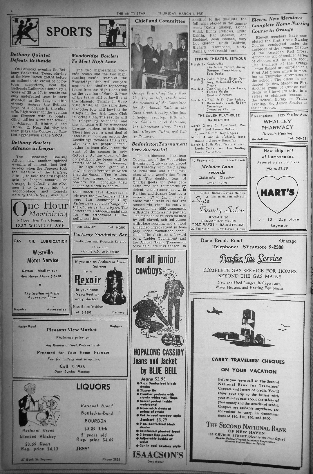 On Saturday evening the Bethany Basketball Team, playing at the New Haven YMCA before an enthusiastic crowd of hometown supporters, beat the Bethesda Lutheran Church by a score of 28 to 17, to remain the only undefeated team in their division in the league. This victory insures the Bethany boys of a chance in the playoffs. High scorer for the evening was Simpson with 12 point. Other tallies were: MacDonald, 6; Johnson, 5; Winter, 3; and Giblin, 2. Next Saturday the team plays the Montowese Baptist aggregation at the YMCA.
