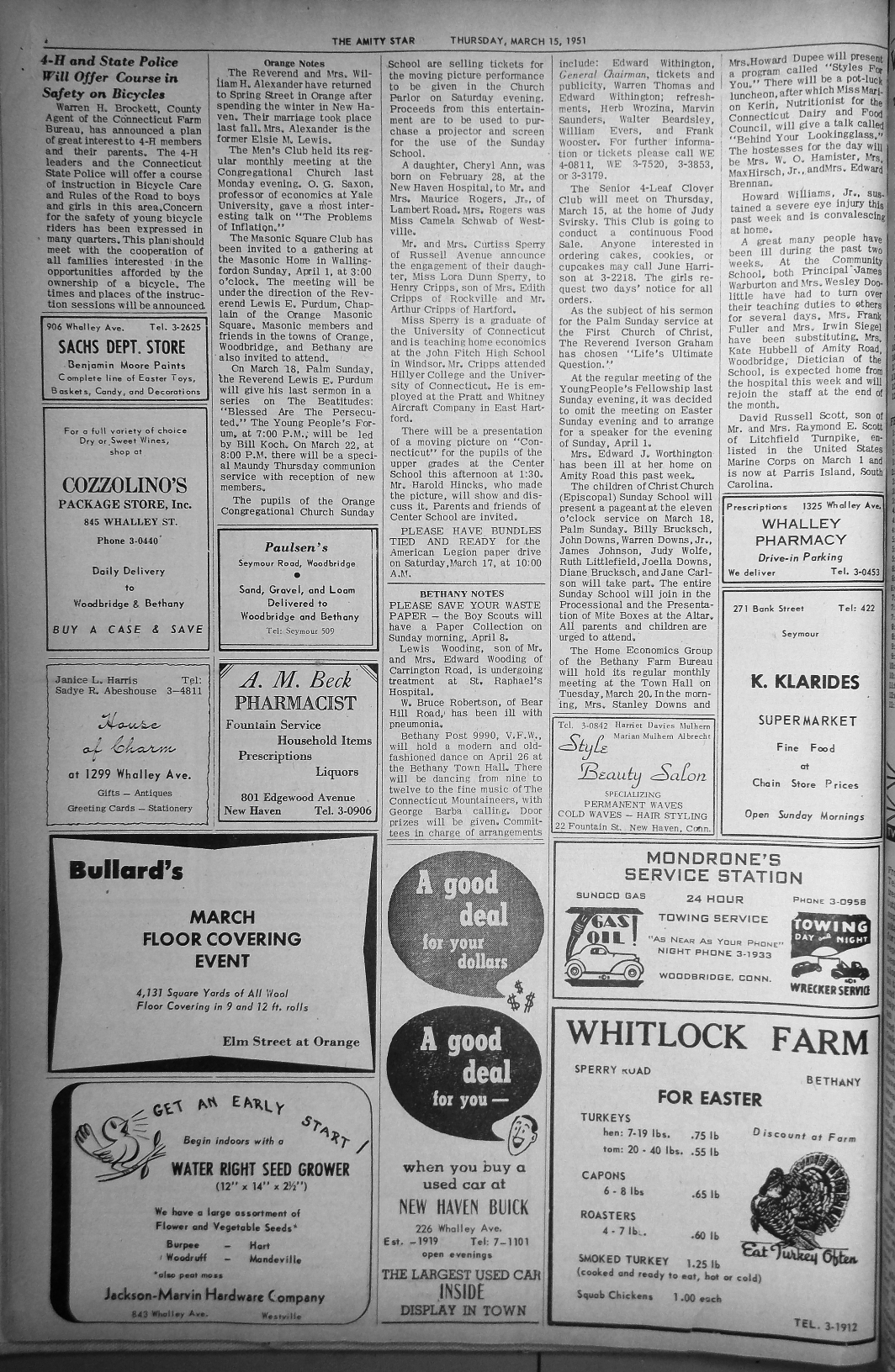 Warren H. Brockett, County Agent of the Connecticut Farm Bureau, has announced a plan of great interest to 4-H members and their parents. The 4-H leaders and the Connecticut State Police will offer a course of instruction in Bicycle Care and Rules of the Road to boys and girls in this area. Concern for the safety of young bicycle riders has been expressed in many quarters. This plan should meet with the cooperation of all families interested in the opportunities afforded by the ownership of a bicycle. The times and places of the instruction sessions will be announced.