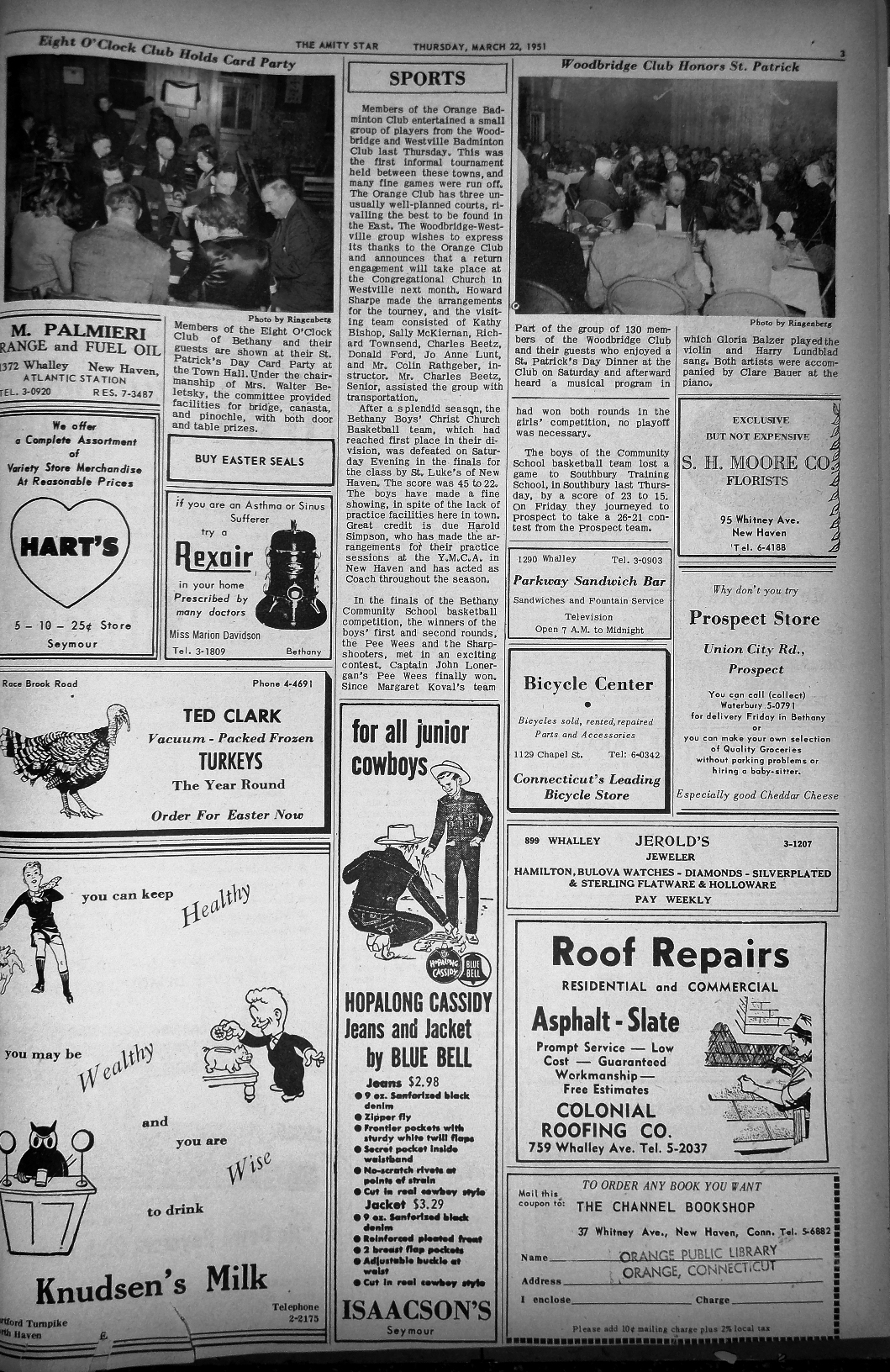 After a splendid season, the Bethany Boys' Christ Church Basketball team, which had reached first place in their division, was defeated on Saturday Evening in the finals for the class by St. Luke's of New Haven. The score was 45 to 22. The boys have made a fine showing, in spite of the lack of practice facilities here in town. Great credit is due Harold Simpson, who has made the arrangements for their practice sessions at the Y.M.C.A. in New Haven and has acted as Coach throughout the season.
